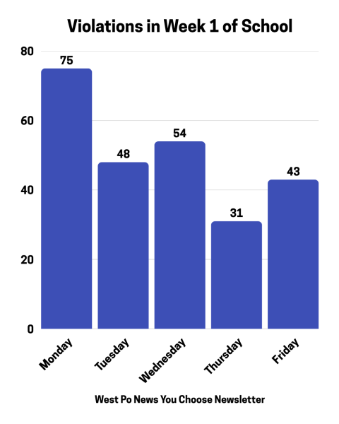 Implementation of the new cellphone policy at West Po began on the first day of school. The policy requires confiscation of student devices at first violation. Subsequent violations face heftier consequences, such as detention, parent-administration conferences, and confiscation of devices at the start of the school day for 20 days. Over the course of the first week, 251 phones were confiscated, according to data released by Principal Statz in the WPHS News You Choose newsletter that week. As of Sept. 24, 995 violations were reported, 202 students have obtained multiple violations and 141 total staff members have reported violations.